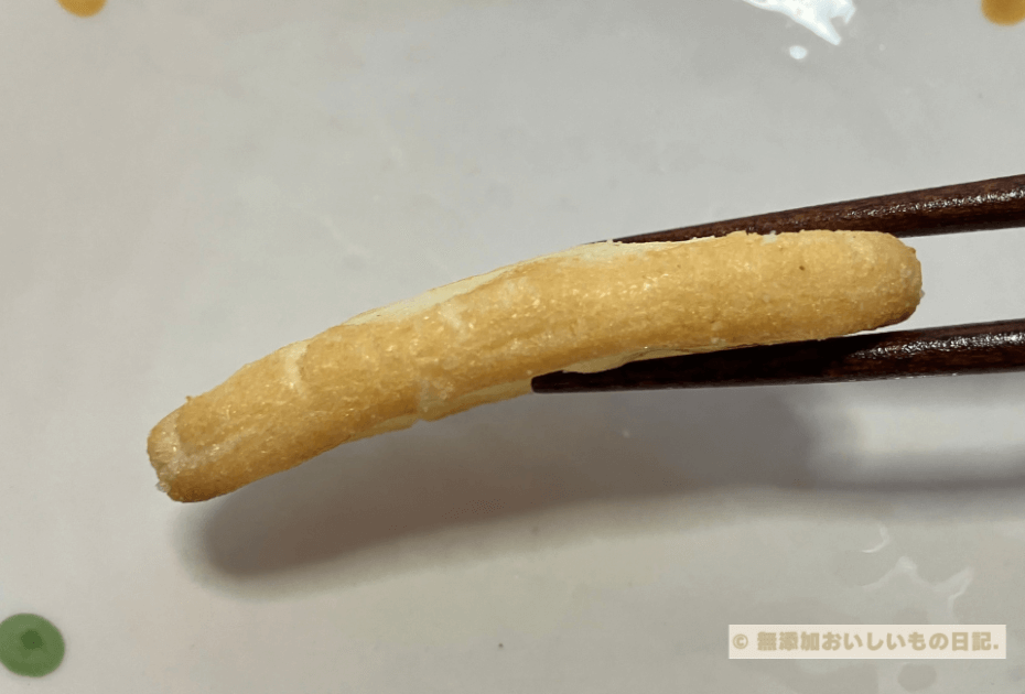 買うときはあんまりよく見てなくて、勝手に、よくある円形のお煎餅かなと思っていたら、2〜3口で食べられそうな、小さな半月型でした。